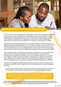 In the face of South Africa's staggering youth unemployment crisis, Masana Energy Solutions (Masana) is demonstrating a profound commitment to empowering the nation's future workforce. By actively participating in the Youth Employment Service (YES) “Yes for Youth” program, Masana is creating critical pathways to employment for young people who, find themselves without employment opportunities. South Africa's youth unemployment rate remains one of the highest in the world. The latest data from the Quarterly Labour Force Survey done by Statistics South Africa, shows that a significant percentage of individuals aged 15-34 are unemployed, creating a critical social and economic challenge. A primary barrier for these young job seekers is the "experience trap," where they cannot secure a job without experience, but cannot gain experience without a job. The YES for Youth program directly confronts this issue, and partners like Masana are proving to be essential catalysts for change. News CSI MASANA EMPOWERS SA YOUTH THROUGH THE YES PROGRAM Masana Petroleum Solutions is committed to uplifting communities through focused Corporate Social Investment (CSI) initiatives. Key areas include Education, Youth Development, Health, Environment, and Community Development. These efforts reflect Masana’s dedication to responsible corporate citizenship and positive social impact in South Africa. “Since joining the initiative in 2023, Masana has provided an opportunity for structured, quality work experience for 56 unemployed young people. This is not just a statistic; it represents 56 lives transformed with the opportunity to develop crucial on-the-job skills to help tackle the "experience trap" challenge and build a professional foundation. Underscoring our commitment to sustainable careers, Masana aims to transition at least five of these individuals into permanent roles, turning practical training into long-term employment”, says Morena Sithole, Managing Director of Masana. The YES for Youth program, a groundbreaking collaboration between the private sector, government, and labour, stands as the country's largest private-sector-funded pipeline for new talent. Its impact is formidable: · Over 135,913 work experiences have been created for youth across South Africa since its inception. · This has injected a remarkable R7.4 billion directly into the economy through youth salaries. “By investing in the YES program, Masana is not only fulfilling its corporate social responsibility but is also creating tangible opportunities amidst the national crisis. By equipping young South Africans with the skills and experience they desperately need, Masana is helping to build a more inclusive, skilled, and prosperous future for all’, concludes Morena Sithole.