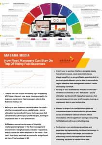 How Fleet Managers Can Stay On Top Of Rising Fuel Expenses Despite the cost of fuel increasing by a staggering 67.5% over the past year alone, the scary reality for business owners and fleet managers alike is this Business must go on As long as your business has vehicles on the road – whether occasionally or on a daily basis – you’re ultimately burdened with heavy fuel expenses that can seriously cut into your profit margins, leaving an unpleasant dent in your bottom line. At Masana, we are keenly aware of the daily challenges being faced in the fleet management environment: rising fuel costs, industry regulations, and of course the white elephant in the room – fuel theft. Fuel fraud and theft accounts for a significant portion of fuel wastage in SA. It isn’t hard to see how this fact, alongside steady fuel price increases, could potentially have a disastrous effect on any profitable operation; but by partnering with Masana, you’re able to successfully regain effective fleet management control – while eliminating fuel theft. As long as your business has vehicles on the road – whether occasionally or on a daily basis – you’re ultimately burdened with heavy fuel expenses that can seriously cut into your profit margins, leaving an unpleasant dent in your bottom line. Masana’s range of on-road solutions gives our customers access to Wholesale List-priced diesel across an extensive national network; which immediately affords significant savings over paying full Retail cost with every refuelling stop. Furthermore, our solutions are cashless and paperless; by implementing the latest technology to manage your fleet’s fuel usage, you’re able to effectively control fuel expenditure without attracting any bank or transactional fees. MASANA MEDIA How Fleet Managers Can Stay On Top Of Rising Fuel Expenses MASANA EDIA