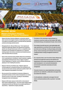 MASANA MEDIA Masana Petroleum Solutions (Masana), a pioneering majority black-owned and managed company is celebrating twenty years of excellence and positive impact in the South African petroleum products and energy solutions sector. Managing Director, Morena Sithole says, “From inspired and aspirational beginnings, Masana has experienced exceptional growth over the past twenty years, built on a competitive value proposition that anticipates and responds to our customers’ evolving needs in the various commercial and industrial sectors within the South African economy. None of this would have been possible without the commitment of our valued partners, including our valued customers, suppliers and employees. Moving forward, this is a legacy to build on, further deepening our customer-centric solutions offering and playing our role in fuelling the economy.” Masana’s Chairman, Paul Nkuna says, “Masana’s agile and inclusive approach to business has been the cornerstone of its success over the years and has continued to position itself in the most competitive way possible in the market. We are proud of the commitment of everyone at Masana to growing the business, and the critical role played by our various partners across our value chain, including our shareholders, management team and employees.” Masana is 54% black-owned, of which 23% is in the hands of black women. Multinational bp - one of the world's largest energy companies and with over 100 years of successful operations in South Africa – holds 50.5% of equity ownership. The balance of the ownership is held by Kwanati, an investment consortium made up of Ata Capital, DBF Capital and Kwande Energy, and employees through a share scheme. The company has built long-term, solid relationships with large organisations across South Africa through its product and client service offerings, including strategic partnerships with bp, Castrol and Energy and Combustion Services (ECS), a leading provider of energy management solutions to industry. As a corporate citizen, and in line with its Values, Masana has pioneered and supported numerous CSI initiatives and programmes in focus areas including health care, education, youth development, rural community development, environmental conservation awareness and waste management. “We wish to thank all our valued stakeholders and business partners for your dedication, collaboration and support that has enabled this milestone. It is this dedication, collaboration and support that will ensure continued excellence with our partners” concludes Sithole. MASANA MEDIA Masana Petroleum Solutions Celebrates 20 Years of Excellence